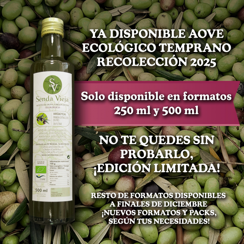 Infórmanos sobre tus necesidades. Próximamente pondremos a disposición de nuestros clientes nuevos formatos: miniaturas de 20 ml, 40 ml y 100 ml de AOVE ecológico Senda Vieja para desayunos y cestas de regalo.